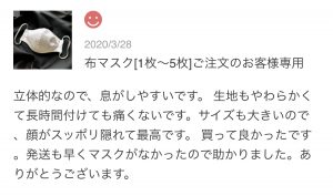 お届けまでにお時間を頂戴している私たちが作る布マスクについて、早くに注文してくださったお客様からのレビューが届いてきています。