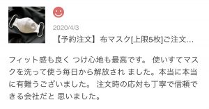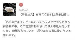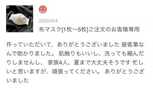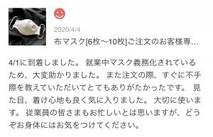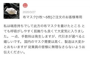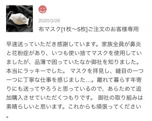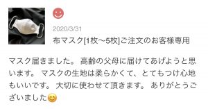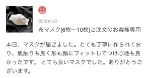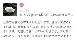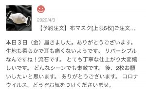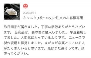 お届けまでにお時間を頂戴している私たちが作る布マスクについて、早くに注文してくださったお客様からのレビューが届いてきています。