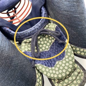 (2)外に出した紐を引き、突き垂の後ろ側に回して結びます。