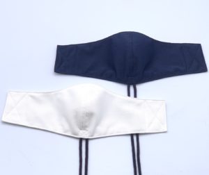 ポリエステル90%・綿10%「抗菌防臭・吸水速乾」の国産生地を選択し、顔に優しく添い、口を塞ぎつつも呼吸が苦しくならないくらいの空間ができるように立体設計を採用しています。アゴ紐を面金に固定し、まるでテントを張るような形に設計することで、飛沫を軽減させる構造になっています。