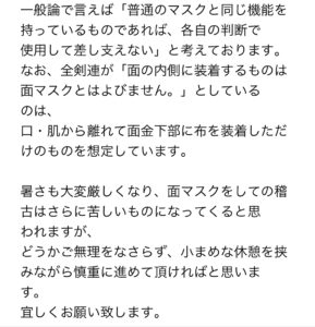 なお、全剣連が「面の内側に装着するものは面マスクとはよびません。」としているのは、口・肌から離れて面金の下部に布を装着しただけのものを想定しています。