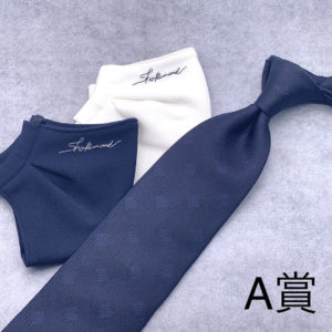 私たちの原点で、初リリースから多くの方にご愛顧いただいておりますSHAKUNONEオリジナルロゴの深紺ネクタイを1本と、さり気なく入った刺繍がアクセントになるSHAKUNONEサイン入りのマスク、ホワイトベースとネイビーベースの各1枚を5名様にお送りします。※15,000円相当