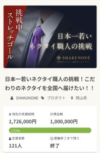 今でこそよく聞くようになったクラウドファンディング。それが浸透し始めた2017年。思い切ってこれに賭けて挑戦しました。そこで、自分たちの代表商品となるロゴネクタイと言うものが生まれました。1カ月で1本売れるかどうかというところから、いきなり30日間で100万円の目標を立ててのちょうせんでしたが、多くの方に支えていただき、目標を大きく上回る172万円もの支援を募ることができました。これをきっかけに、大手の百貨店さんから声がかかりはじめ、イベントの開催ができるようにもなったんです。