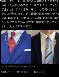 このネクタイのディンプルマナー炎上の件に関して今僕が言えるのは『自由であり、マナーとして押し付けるものではない』ということです。自分の間違いを認めたくないという意図で名言を避けているわけではありません。間違っていたと僕が結論づけていいものではないと思っています。ただハッキリしない曖昧な情報を、さぞこれが正しいマナーというような決めつけの発信をしてしまったことは事実です。当時のツイートを見て不快な思いをさせてしまった方、どん底にいるときに心配をかけてしまった方たち、ごめんなさい。